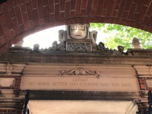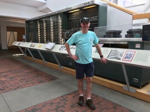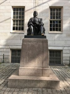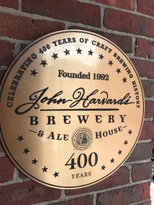 David, our guide, with Harvard Crest visible through window.Where Lampoon is written, which was inspiration for SNL and the National Lampoon movies.Wow…Mark gets in at Harvard!The expectation as you leave Harvard.Lawn where Harvard main graduation ceremony is held.A panorama of the graduation lawn.Built at end of Civil War: Where Freshmen dine for all their meals.Supposed be statue of John Harvard but isn’t! Also, peeps rub toe for luck (see the shine). David, our guide, says students use statue to have weeing competitions though and he won’t go near it!Venue for our lunch: John Harvard Brewery.Us at lunch.Mark’s thinking of adapting this for a more local theme!JFK exhibit; a Harvard alum. 100 yrs since his birth!JFK’s report card from his Freshman year!Mark Zuckerberg’s Harvard House, where he worked on FB!